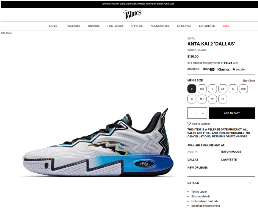 Sneaker Politics는 2006년, 미국 루이지애나주 라파예트(Lafayette)에서 시작된 스니커 부티크입니다.